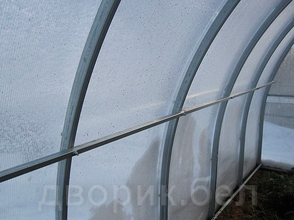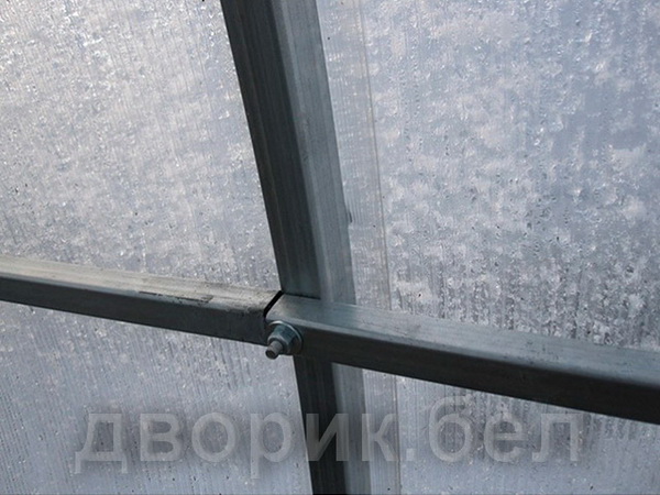 Широкие цельногнутые дуги 40х20 мм, несущие основную нагрузку, надежно скрепляются поперечными планками и позволяют выдерживать практически любые погодные условия Беларуси. Данный каркас - самый прочный из "безкрабовых" и рекомендуется для сложных условий эксплуатации.