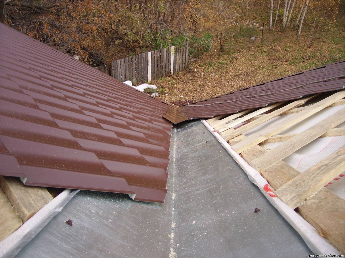 - планки составного желоба уложены снизу вверх с герметизацией стыков; при этом верхние планки накрывают нижние на 10–15 см (меньше угол уклона ендовы — больше напуск);